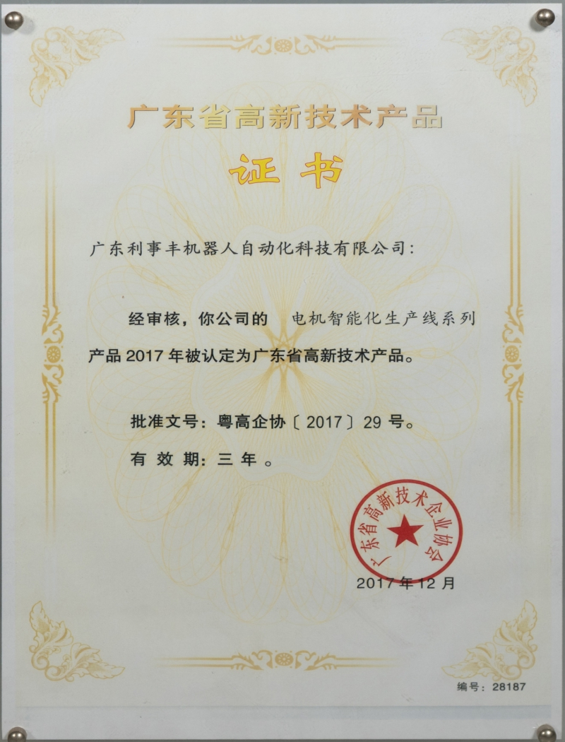 高新技術(shù)產(chǎn)品證書-電機智能化生產(chǎn)線系列
