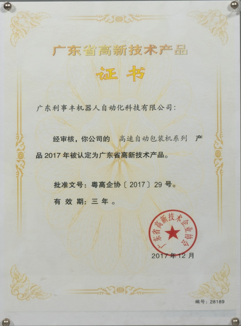 高新技術(shù)產(chǎn)品證書-高速自動(dòng)包裝機(jī)系列