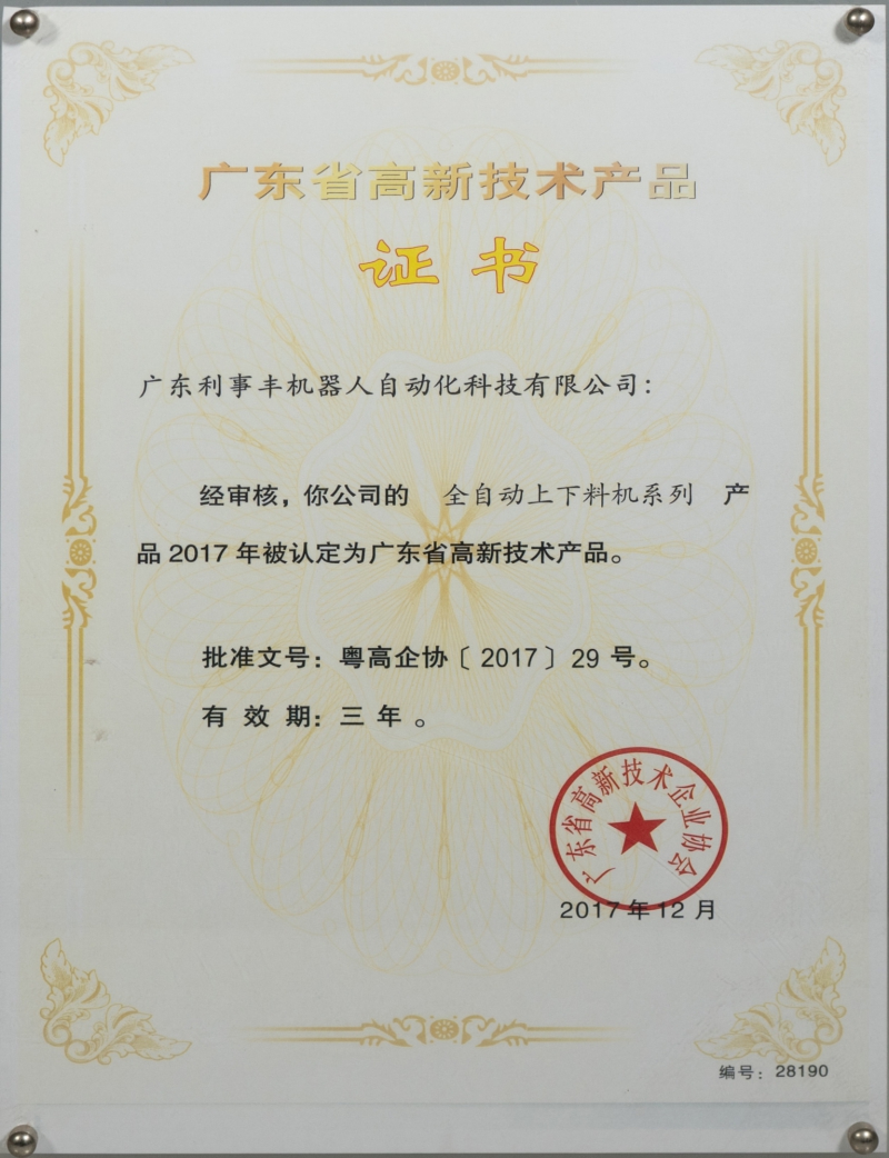 高新技術(shù)產(chǎn)品證書-全自動上下料機系列