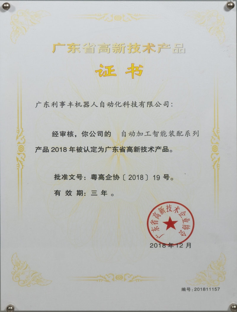 高新技術(shù)產(chǎn)品證書-智能加工自動裝配系列